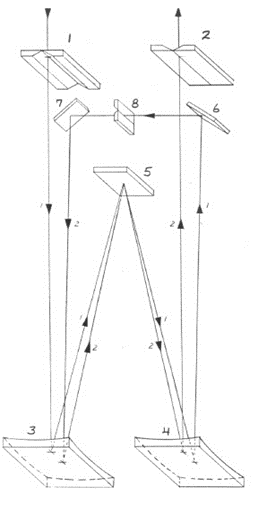 Double Pass 光路结构: 1.入射狭缝;2. 出射狭缝; 3. 准直反射镜; 4. 聚焦反射镜; 5. 光栅; 6. Double Pass反射镜;  7. Double Pass 反射镜; 8.中央孔径狭缝