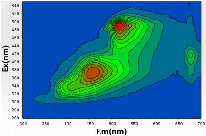 三维荧光光谱(EEMs)是将荧光强度以等高线方式投影在以激发光波长和发射光波长为纵横坐标的平面上获得的谱图,图像直观,所含信息丰富。