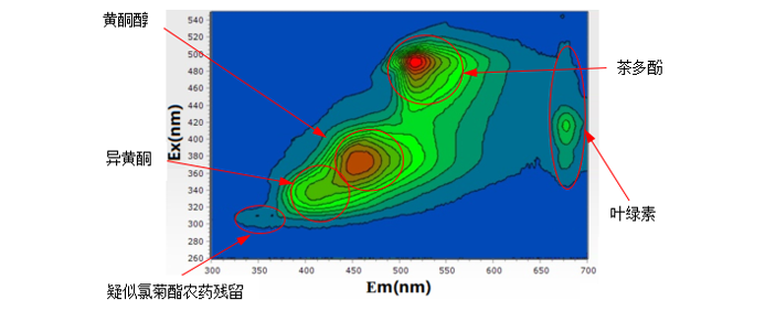 每种茶叶中均含有黄酮醇、茶多酚、叶绿素c、叶绿素a,其含量影响着茶叶的感官品质,使用三维荧光能快速检测茶叶中四中物质的相对含量,进而通过三维荧光光谱对茶叶进行分级。另外三维荧光谱对茶叶中氯菊酯农药残留也有较好的检测效果。
