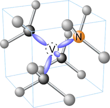 图2:金刚石中NV色心由碳原子(灰色)、氮原子(橙色)和相邻空位组成,并有悬空键(紫色)[1]。