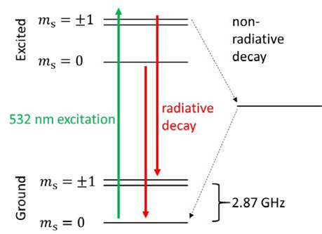 顾名思义,氮空位色心(NV-Nitrogen-Vacancy center)(图2)是由一个氮原子取代金刚石中的一个碳原子,然后捕获周围的一个空穴形成的。在NV位上悬浮键的电子通过杂化产生自旋-1系统,具有明确的能量状态和较长的自旋寿命,即使在室温下也是如此。这样就可以通过磁共振的自旋操控技术在精确定时的微波磁场下来控制NV点的自旋状态。由于它的能级对外部磁场和电场都很敏感,使得这种自旋状态可以作为外部环境的传感器。