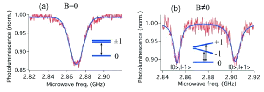 众所周知,金刚石中的缺陷会使原本透明的晶体产生颜色(例如,氮取代缺陷使金刚石呈现黄色,而硼取代则产生蓝色)。在532nm激光激发下,NV在637 nm处产生荧光衰减。重要的是?s=±1自旋态是无辐射衰减,从而提供了一种利用监测光致发光变化来检测自旋状态的方法。也就说,当自旋态被激发到不稳定态?s =±1级(使用2.87 GHz微波),有缺陷的红光输出会略有减少(图4 (a))。此外,?s =±1的能级状态可以被外部磁场调节。通过测量吸收峰之间的频率分裂(如图4(b)所示),可以测量出该外部磁场。