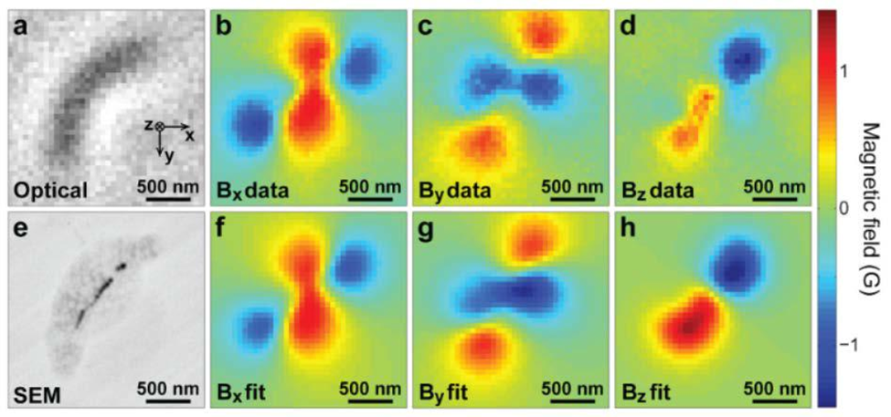 图5。(a)趋磁细菌的光学图像。(e)同一细菌的SEM图像,其中磁性纳米粒子(黑色)清晰可见。(b,c,d)磁场x, y, z分量由NV金刚石光学探测磁共振测量确定。(f,g,h)实测场分布的数值拟合(来自[g])。