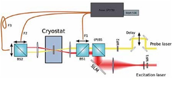 在实验中采用脉冲钛宝石激光器,空间光调制器,5K低温制冷机,收集光路以及Andor SR750光谱仪以及 Andor DU934 深耗尽型CCD。在极化实验中,为了能够测试内部空穴的特性,采用光纤收集反射或者透射的光。而在量子点的实验中,收集的是量子点的发光。通过光纤,我们可以选择不同的空间点进行收集。