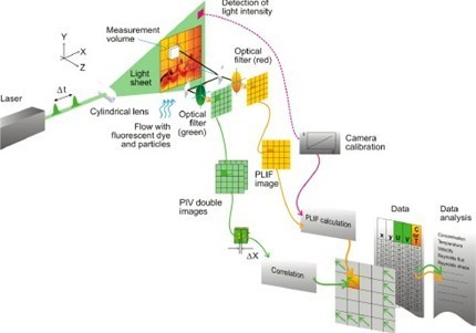 LIF与PLIF目前已经广泛应用于上述实验过程中的原子与分子相关参数例如温度与浓度测量中。原子类粒子的检测被称为LEAF(Laser Excited Atomic Fluorescence),这部分粒子可以直接测量,例如燃烧过程中的很多自由基以及粒子都可以通过LIF与PLIF的方法进行直接测量。但是若实验过程本身并不包含有可以通过LIF与PLIF直接激发的粒子,则必须通过加入示踪粒子的办法进行成像测量。