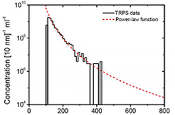 我们改进了TRPS系统上层液体,(Izon Science Ltd, Christchurch, New Zealand) 使膜孔有了光学延展性。改进之后,我们评估了TRPS检测人体尿液囊泡的尺寸和浓度。之所以选择尿液囊泡,是因为尿液里含有较高浓度的尿液囊泡,同时脂蛋白和蛋白质集结的污染程度较小。图3显示了用TRPS测量的尿液囊泡的尺寸分布以及浓度,尿液囊泡的浓度随着尺寸的增加而降低,我们能检测到的*小尺度的尿囊为100nm直径