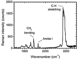图4.单血小板源性囊泡的拉曼光谱图。拉曼峰表征了出现在这种囊泡内的特征化学成分