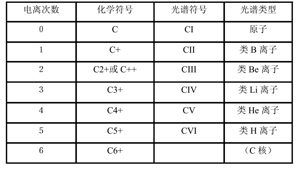 在等离子体参数较低的小型托卡马克装置上,等离子体的辐射主要位于真空紫外和可见光波段。下图为捷克一个小托卡马克装置 CASTOR 中的等离子体发射光谱,主要在真空紫外和可见光波段。其线状谱主要是 O,N和 C 的杂质谱线。从等离子体发射光谱图上可以较为容易地辨别等离子体中杂质的种类和电离状态。以 C 为例,谱线上标志的光谱符号和相应的电离态的关系如下表所示: