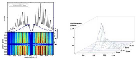 通常来讲,等离子环境具有高动态和瞬时的特性,所以成像及光谱信息要在数十纳秒(甚至皮秒量级)的时间内进行捕获。此时普通探测器无法提供这么高的时间分辨率,像增强型探测器(ICCD/ICMOS)是较为合适的探测器,它的像增强器光阴极门控能提供纳秒量级的时间闸门。特定波长的带通可以筛选出特定化学结构(分子,原子团,原子,离子等)的特征光谱,滤光片只需要在ICCD相机前安装好,就可以用于2D PLIF或者LIF图像的采集。