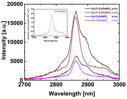 Ho:CaGdAlO4和Ho,Pr:CaGdAlO4晶体在1550nm激发下的中红外发射光谱