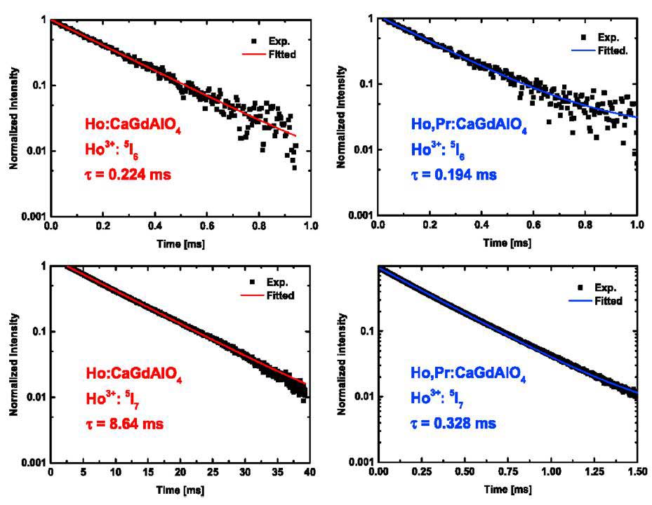 Ho:CaGdAlO4和Ho,Pr:CaGdAlO4晶体荧光衰减曲线