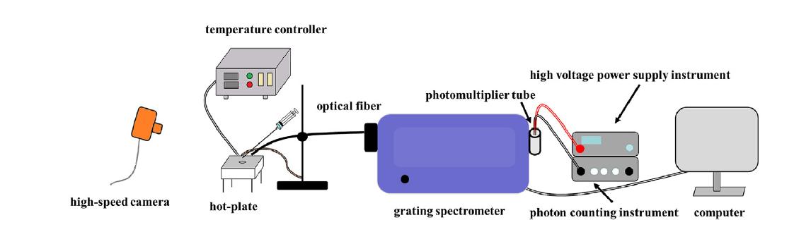 上图为相关的实验简图,图中科学家将掺有一定比例活化剂的煤油滴到变温台上,变温台可以从100度到600多度控制,高速相机拍摄液滴在变温台上随温度变化后的燃烧情况。而在燃烧时火焰发光通过光纤收集到光谱仪中,再由PMT监控发光波段随时间变化的衰减过程。整个实验中,监控燃烧产物OH自由基的发光波段306.5nm,光谱仪将色散位置设置到该波段,然后用PMT进行监控。监控过程中PMT高压设置为1000V,使其处于光子计数状态,然后连接数采,对OH发光进行实时监控扫描。