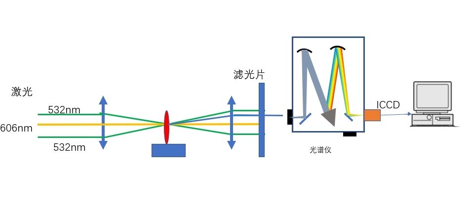 如果将染料激光器引入实验,在Nd:YAG 激光器后面接上染料激光器,用532nm泵浦我们可获得多个波段的激发激光,例如606nm的激光,然后经与两束532nm激光在时域上进行调整,在满足CARS的相位匹配条件下,我们可以得到相关的CARS信号,从而可以用来分析燃烧场的温度和组分浓度信息。