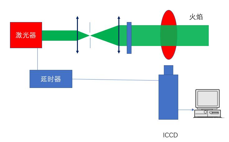 在燃烧过程中,燃烧不充分会产生很多中间产物,我们也可以用激光激发火焰中这些中间产物获得荧光来分析,也就是激光诱导荧光(LIF),如果将激光经过柱面镜等光学元件整形成很薄的一个平行平面光,这是我们称该实验为平面激光诱导荧光(PLIF)