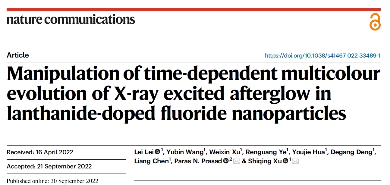 近日,中国计量大学光电学院徐时清教授团队在时间维度的颜色演变研究领域取得重要进展,研究成果以“Manipulation of time-dependent multicolour evolution of X-ray excited afterglow in lanthanide-doped fluoride nanoparticles”为题发表在国际期刊Nature Communications (2022, 13: 5739)上,并被Nature Communications编辑选为Research Highlight重点推荐。中国计量大学雷磊副研究员为**作者,徐时清教授为通讯作者。