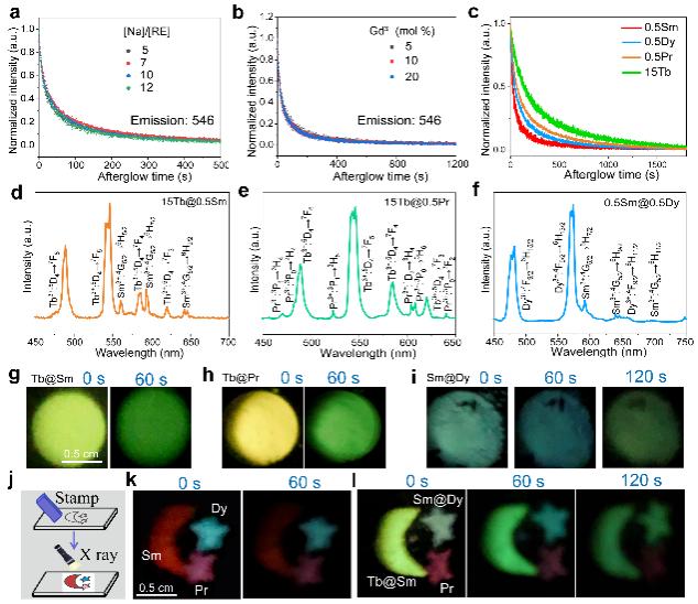 课题组通过创新性地在NaLuF4基质晶格中引入Na+间隙,大幅增强了稀土激活离子(Tb,Dy,Pr和Sm)的X射线余辉发光,结合光谱分析与*一性原理计算,提出了Na+间隙促进阴离子弗兰克缺陷的形成机制;采用核壳结构空间分离不同类型的稀土激活离子,实现了无外场刺激条件下依赖于时间维度的多种余辉颜色演变体系(图2)。