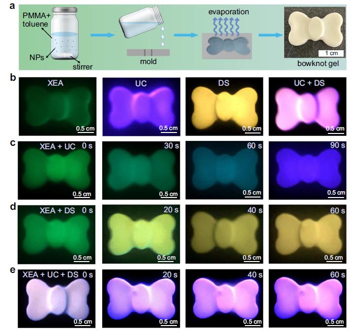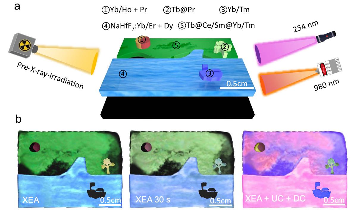 文章结尾用一个有趣的实验为读者展示了XEA材料在多维显示器件中的应用场景(图4)。作者分别使用了Tb@Ce/Sm@Yb/Tm, Tb@Pr,和NaLuF4:Yb/Tm(仅具有核结构)的纳米粒子作为绘画原料画出云朵、树木和小船。采用仅具有核结构的NaLuF4:Yb/Ho and NaLuF4:Pr画出月亮,而湖泊则使用Na3HfF7:Yb/Er和NaLuF4:Yb/Ho(仅有核结构)的混合物绘画得到。然后使用X射线对这幅画进行照射。当X射线照射停止后,画面显示出绿色的云彩、红色的月亮,黄色的树木和蓝绿色的湖泊。在经过30s后,画面的亮度变暗了,而树木却变成了绿色。当使用980nm激光和254nm的紫外灯同时照射这幅画的时候,云朵的颜色从绿色变成了红色,月亮则从之前的红色变成了黄色,树木的颜色由黄色变成绿色,而湖泊的颜色从蓝绿色变成了红色,蓝色的船也出现了。