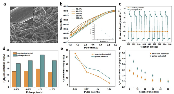 (a) 石墨毡的SEM图像;(b) 不同扫描速率下的CV曲线;(c) 恒电势(-0.8 V vs. AgCl)和脉冲电位(ta = tc =1 s,Ec = -0.8 V vs. Ag/AgCl,Er = 0 V vs. AgCl)下的ORR电流密度;(d)、(e)不同电位对H2O2产生和电流效率的影响(脉冲电势ta = tc = 1s);(f) 脉冲电位电催化和恒电位电催化(ta = tc = 1 s, Ec = -1.0 V vs. AgCl)下H2O2的生成速率。