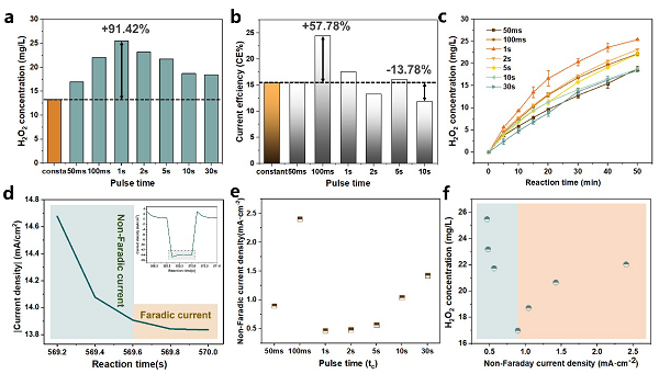 过氧化氢(H2O2)是一种广泛用于漂白消毒、化学合成、废水处理的绿色氧化剂,在能源和环境领域具有很高的应用前景。目前常采用绿色、低成本且对环境友好型的2电子氧气阴极电还原反应(2eORR)原位制备H2O2。但其存在动力学迟缓、H2O2产率较低等问题,其本质原因在于电极/溶液界面电子转移速率、电化学反应速率和产物扩散速率之间的时空不匹配性。脉冲电催化是一种可操作、高效的反应调控技术,可实现对电子传输的精准控制,改善质量传递,强化反应动力学并调节产物选择性,目前已被应用于析氢反应(HER)、CO2还原反应(CO2RR)、有机污染物阳极氧化反应及电沉积反应。