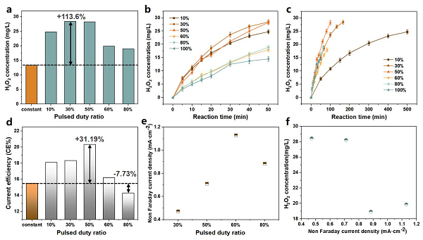 (a-c) 不同脉冲占空比(D)对H2O2产率的影响(t+ tc = 2s, Ec = -0.8 V vs. Ag/AgCl);(d)不同脉冲占空比下ORR电流密度(d);(e)脉冲占空比对非法拉第电流密度的影响;(f)非法拉第电流密度与H2O2产生的相关性。