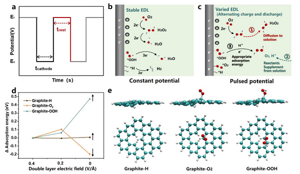 (a)脉冲电催化中的tcathode and trest;(b)、(c) 恒电位电催化和脉冲电位电催化之间的反应路径存在差异;(d) EDL电场强度变化对ORR中间体吸附能的影响;(e) 具有固有缺陷的石墨烯的中间体(*H/*O2/*OOH)吸附模型。