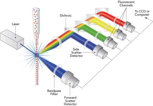 含有被标记的细胞的悬浮液通过管道,一束固定的激光照射到液体上,当每个悬浮颗粒通过光束时会将光散射,同时细胞所标记的荧光化合物被激发并发射出频率低于激发光的荧光,这些散射光和荧光的数据被瞄向这个点的检测器记录,通过线性或对数放大,由计算机分析出每个细胞的各种指标。