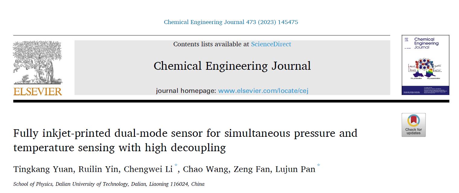 近日,大连理工大学潘路军教授课题组在柔性双模态传感器领域取得重要进展,研究成果以“Fully inkjet-printed dual-mode sensor for simultaneous pressure and temperature sensing with high decoupling”为题发表在工程技术领域期刊《Chemical Engineering Journal》。大连理工大学袁廷康博士为文章*一作者,大连理工大学李成伟助理研究员和潘路军教授为通讯作者。