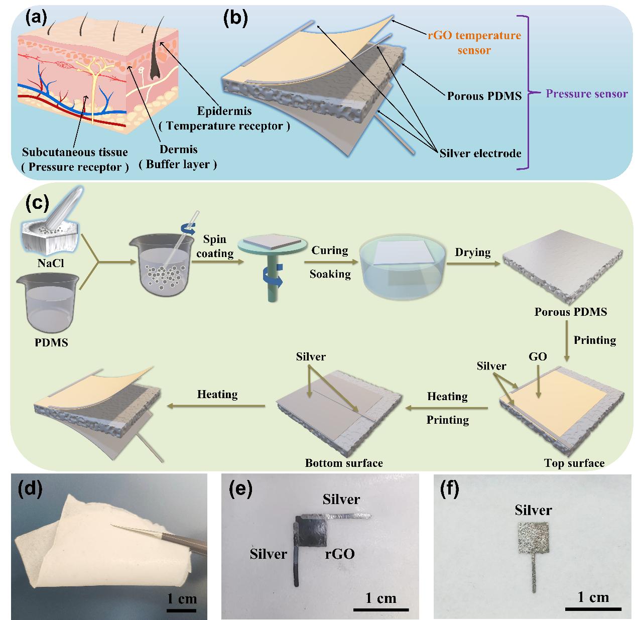 图1. (a)人体皮肤结构示意图。(b)具有仿生结构的柔性压力-温度双模态传感器的结构示意图。(c)利用盐模板法以及喷墨打印技术制备双模态传感器的实验过程示意图。(d)多孔PDMS 介电层的照片。(e)rGO 温度传感器的照片。(f)底部为银电极的数码照片。