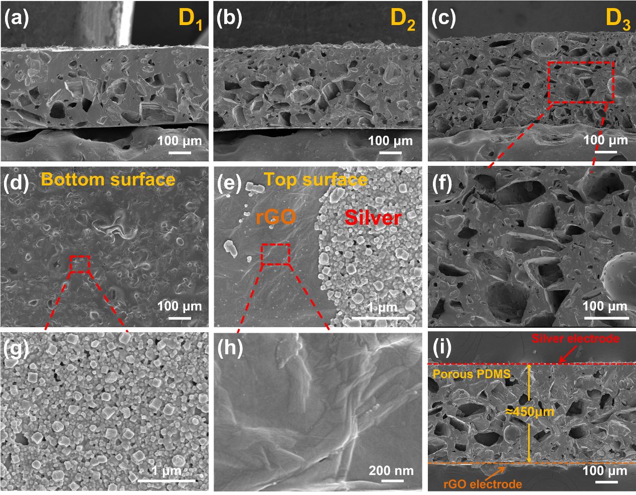 图2. (a)-(c)不同比例多孔PDMS的截面SEM图像。(d)底面和(e)顶面的SEM图像。(f)孔结构、(g)底表面和 (h) rGO 纳米片的放大 SEM 图像。(i) 压力-温度双模态传感器的截面 SEM 图像。