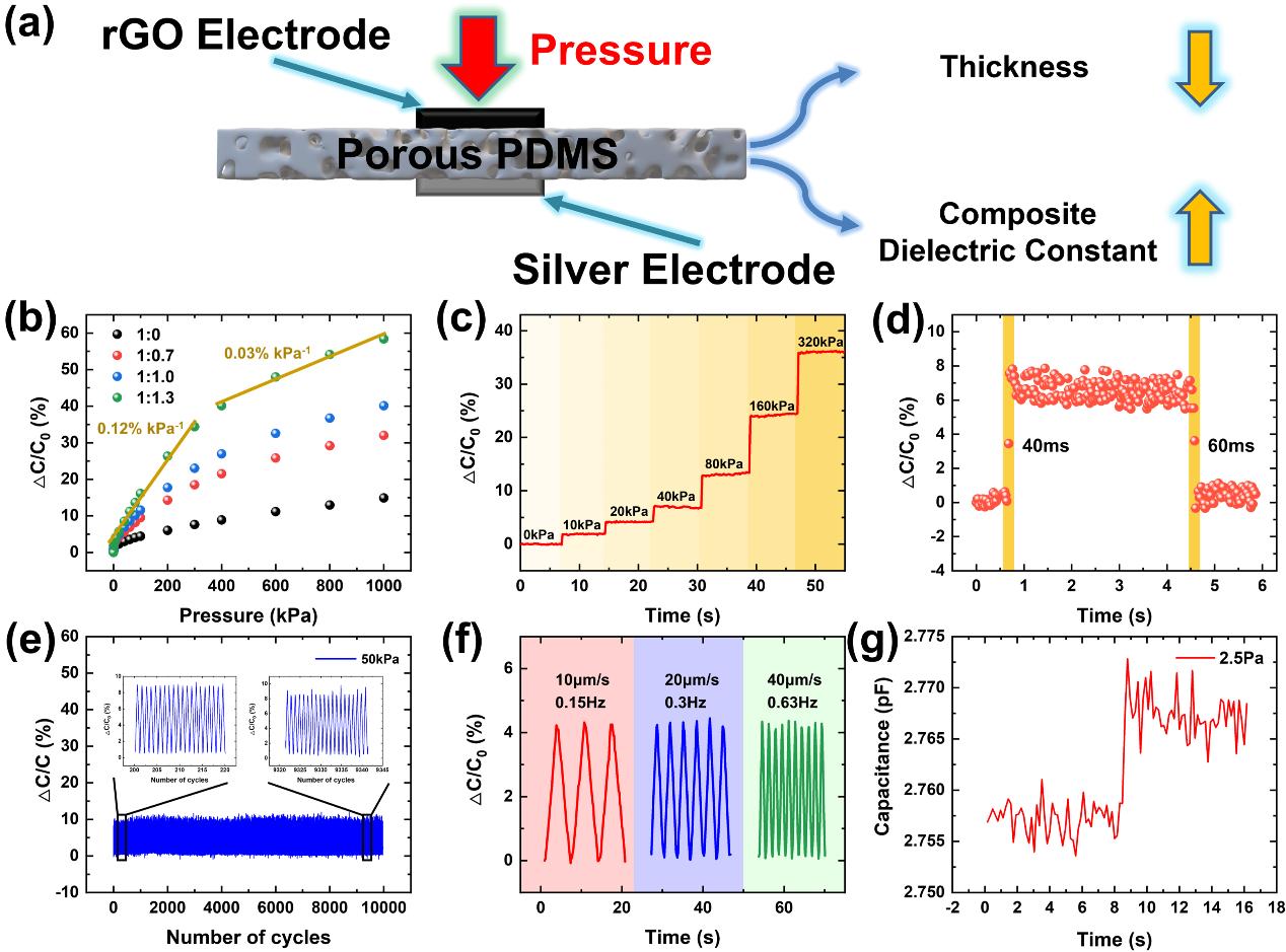 图4. (a)基于多孔 PDMS 的电容式压力传感器的传感机制。(b)不同 PDMS/NaCl 混合比例的多孔 PDMS 压力传感器的压力传感性能。(c)不同压力梯度下的电容响应。(d) 压力传感器的快速响应和恢复时间(小于60 毫秒)。(e)压力传感器在 50 kPa 下 进行10,000 次循环的电容响应。(f)在不同频率下进行 8 kPa 负载压力的电容响应。(g) 压力传感器的超低压力检测极限(2.5 帕)。