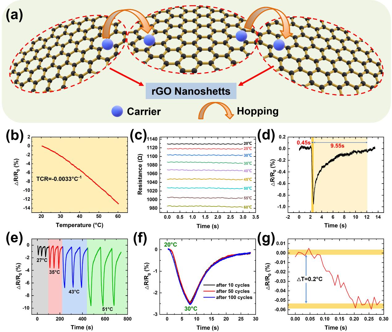 图5. (a) rGO 纳米片的温度传感机制。(b)温度传感器的电阻响应。(c)不同静态温度梯度下的电阻响应。(d)温度传感器在 3°C 温差下的快速响应和恢复时间。(e)不同动态温度梯度循环下的电阻响应。(f)循环不同次后的稳定电阻响应。(g)温度传感器在 0.2°C 温差下的显著电阻响应。