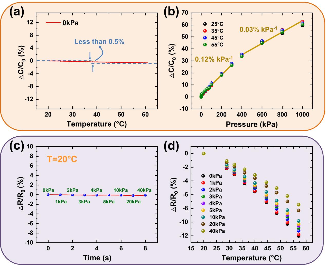 图6. (a) 双模态传感器在无负载情况下的电容随温度的变化。(b)在四种温度下,双模传感器的电容响应与负载的函数关系。(c)在 0-40 kPa 的压力下,温度传感器在20°C时的电阻响应。(d)温度传感器在不同压力下的电阻响应与温度的函数关系。
