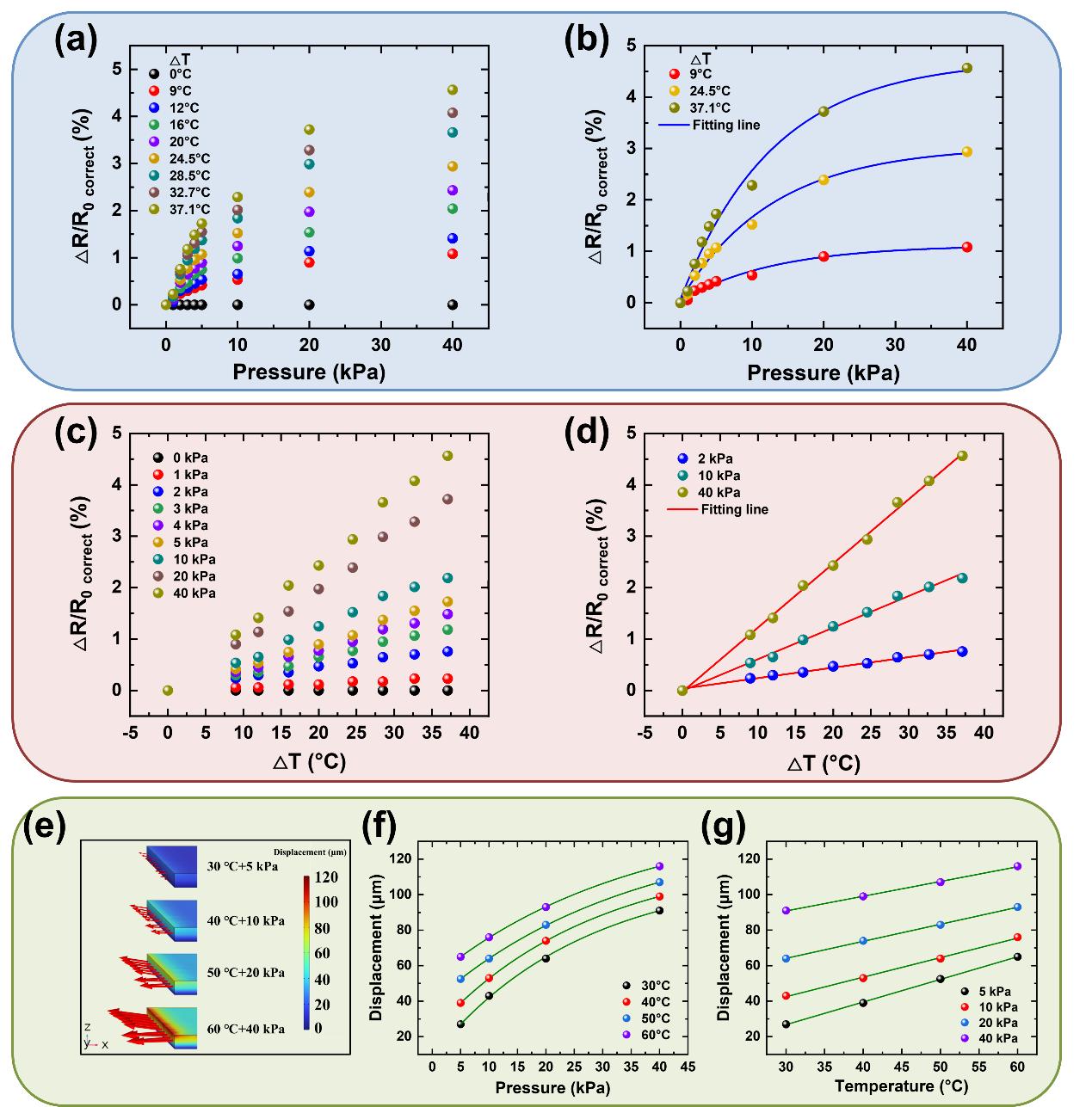 图7. (a)不同温差下电阻变化率的修正值和压力变化的关系。(b)三种温差下电阻变化率修正值与压力的拟合关系。 (c)不同压力下电阻变化率的修正值和温差的关系。(d)三种压力下电阻变化率修正值与温差的拟合关系。(e) 不同压力和温度状态下 PDMS 横向位移分布的模拟结果。(f)-(g) PDMS 在不同压力和温度条件下的横向位移模拟数据。