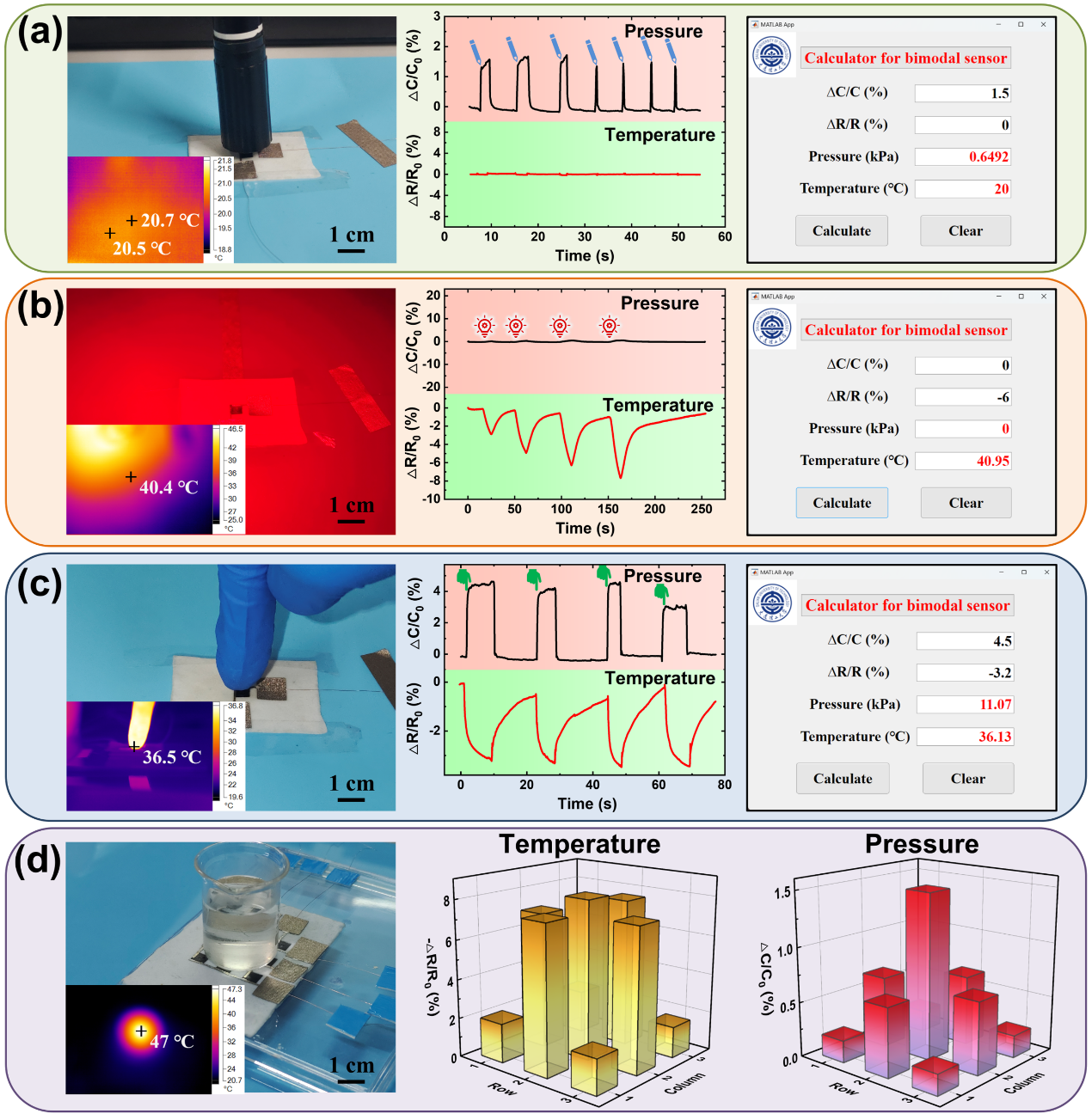 图8. 使用双模态传感器分别监测三种不同情况下的电容和电阻变化:(a)马克笔接触、(b)红外灯照射和(c)手指按压,并通过设计的转换应用程序获得实时温度和压力。(d) 在 3×3 传感阵列上放置一个装有热水的烧杯,不同单元的电阻和电容响应分布。