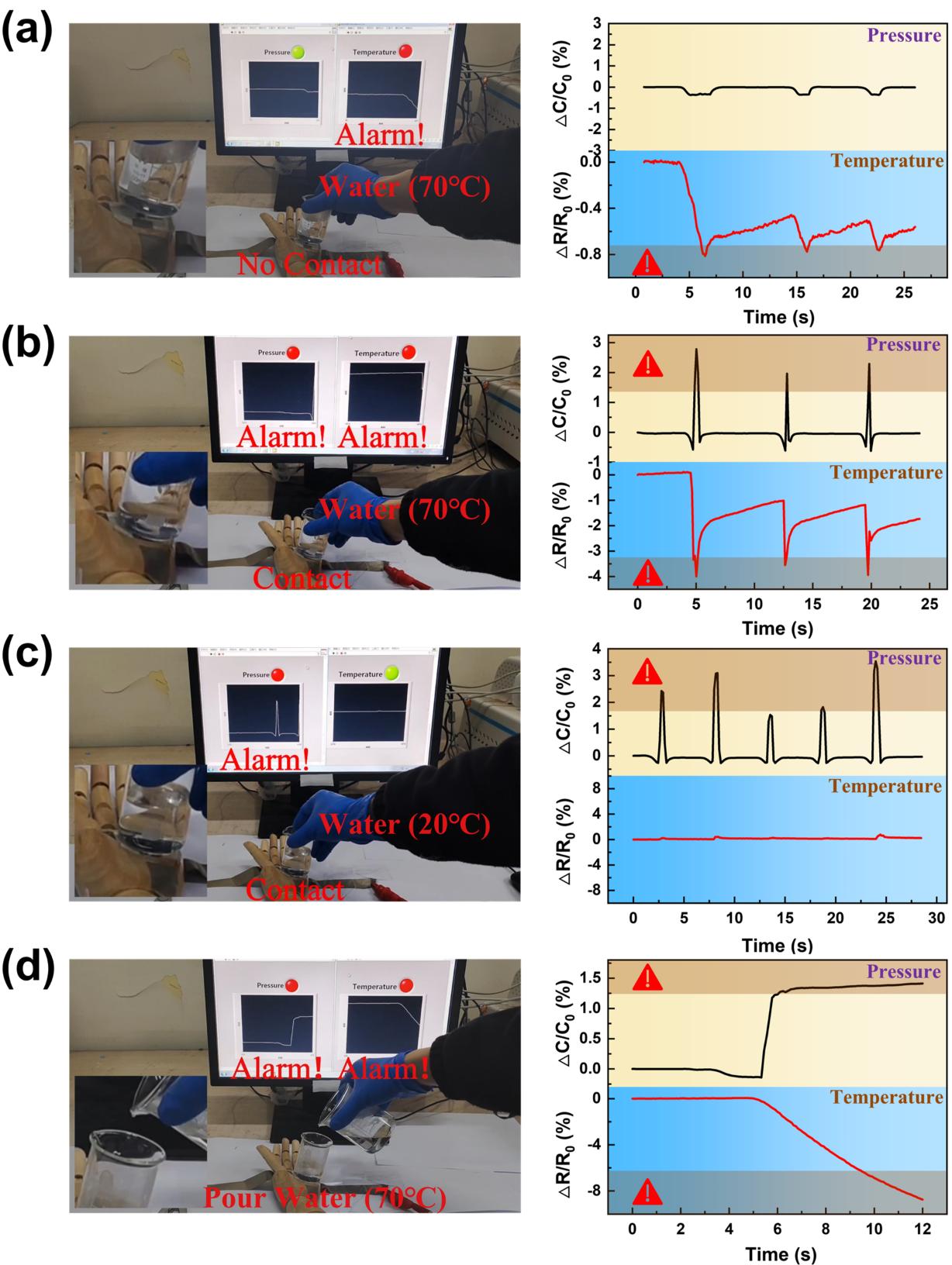 图9. 基于双模式传感器的双重监控和警报系统,可应对各种温度和压力变化。装有热水的烧杯(a)接近双模式传感器时未与之接触,(b)与双模式传感器接触。(c)盛有室温水的烧杯与双模传感器接触。(d)向放置在双模传感器上方的空烧杯中倒入热水