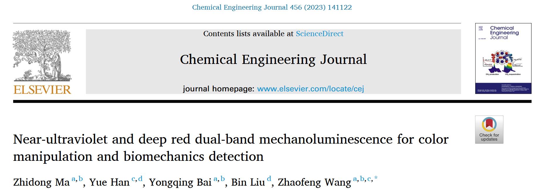 中国科学院兰州化学物理研究所王赵锋研究员团队在国际知名期刊Chemical Engineering Journal上发表的题为“Near-ultraviolet and deep red dual-band mechanoluminescence for color manipulation and biomechanics detection”的研究论文。该文章报道了一种同时具有近紫外和深红色发射的高效力致发光复合弹性体Ca9Bi(PO4)7:Ce3+(CBP:Ce)/聚二甲基硅氧烷(PDMS)。