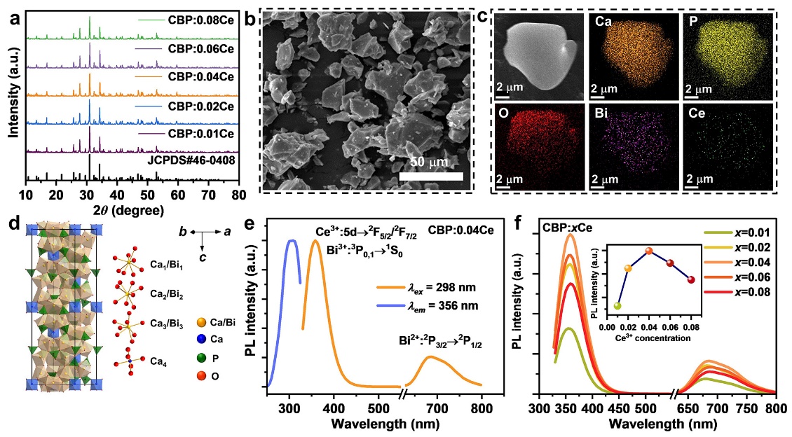 图1 CBP:Ce粉体样品的结构、形貌及光致发光性能