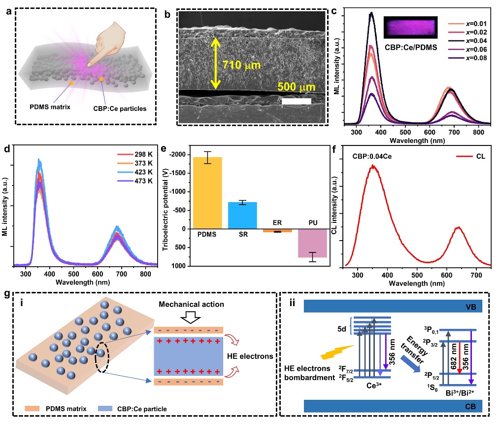本文报道了一种高效的力致发光复合弹性体CBP:Ce/PDMS。由于CBP晶体的限制,结构中同时存在具有发光特性的Bi3+和Bi2+离子。Ce3+的掺杂进一步表现出向Bi离子的有效能量转移,因此CBP:Ce/PDMS在机械刺激下表现出独特且增强的近紫外和深红双波段发射。对热释光、阴极发光、摩擦电特性以及基体效应的进一步研究表明,力学激发/激活过程可以用界面摩擦起电诱导的电子轰击模型解释。CBP:Ce/PDMS的力致发光进一步用于两类应用:通过采用近紫外力致发光作为激发源,多种仅具有光致发光的材料也可以表现出力致发光;通过深红色力致发光在模拟组织中的穿透和传感能力, CBP:Ce/PDMS还可应用于生物力学原位检测。
