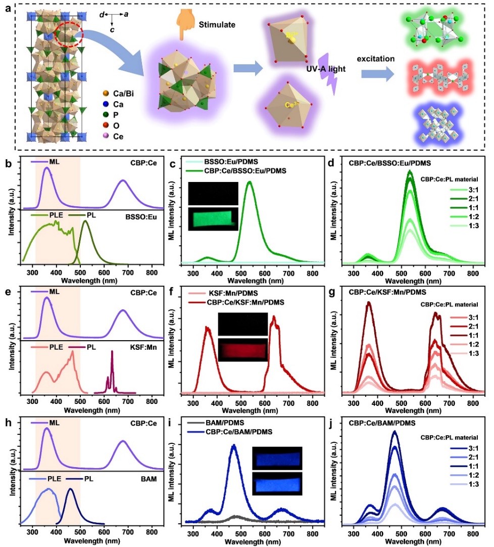 由于激发能级和机械刺激的不匹配性,部分光致发光材料在力学刺激作用下无法显示力致发光。本工作中,当一种光致发光材料复合到CBP:Ce/PDMS弹性体中,在力学刺激下,CBP:Ce/PDMS产生的近紫外光激发光致发光材料,从而显示出各种颜色。由于近紫外光通常作为光致发光材料的激发光源,所以本策略具有普适性。图3(b-j)进一步演示了上述策略,显然,这种基于近紫外力致发光激发的发光调控策略能够赋予光致发光材料优异的力致发光性能,极大地丰富了力致发光材料体系。