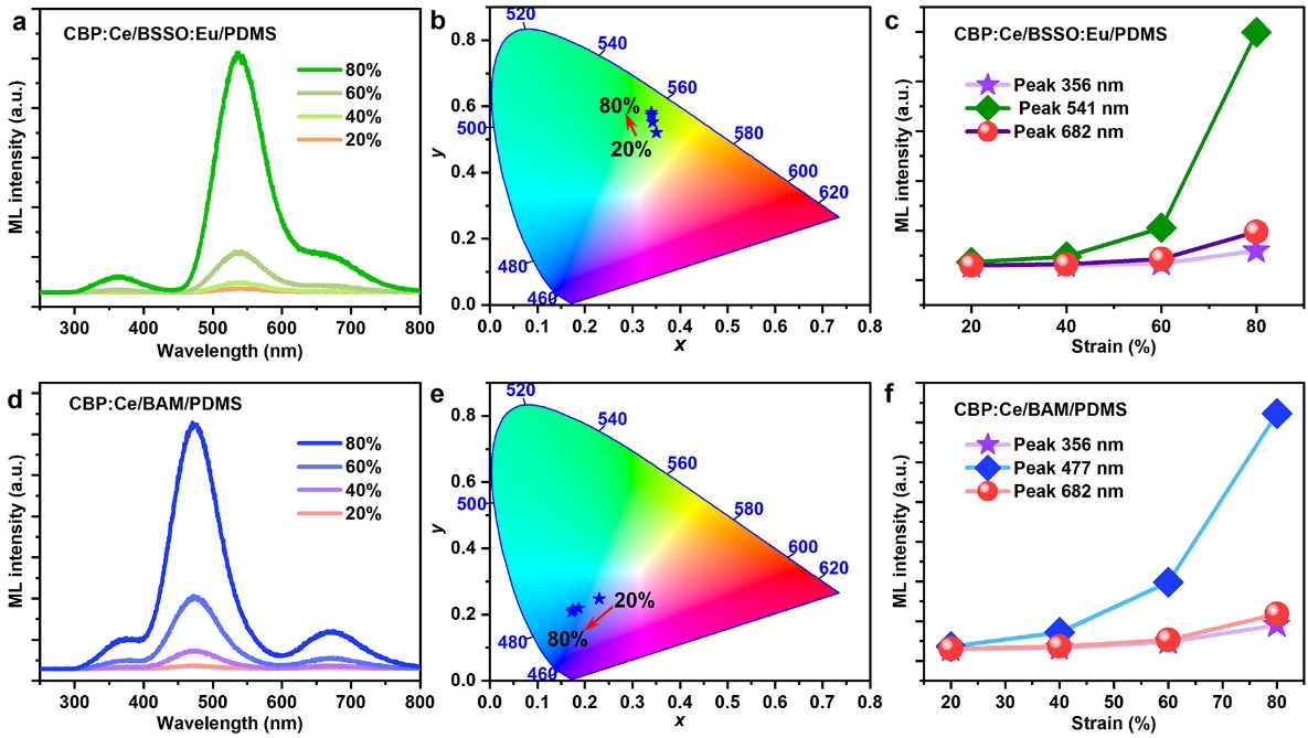 近紫外光调控光致发光材料实现力致发光具有明显的应变响应性。如图4a和4d所示,随着应变的增加,复合材料的力致发光强度均单调增加。此外,力致发光的颜色也发生相应变化。由于复合材料的力致发光强度和力致发光颜色都与所施加应变表现出一对一的对应关系,因此基于力致发光颜色变化的应变响应性可用于开发可视化力学传感设备。