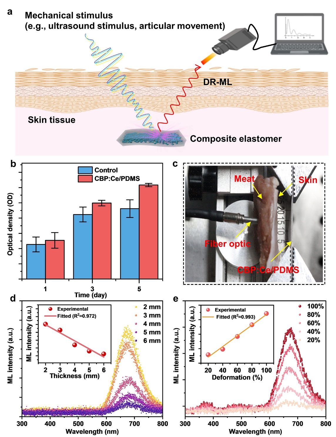 本工作选取猪皮和猪肉组织模拟生物皮肤组织,并在拉伸模式下记录通过上述组织的力致发光信号,证明CBP:Ce/PDMS复合材料发射的深红色力致发光具有很好的穿透性(图5)。生物相容性实验表明CBP:Ce/PDMS复合材料具有理想的生物相容性。深红色力致发光的组织渗透和力学传感能力方面的演示表明,CBP:Ce/PDMS在生物体原位生物力学检测方面具有广阔的应用前景。