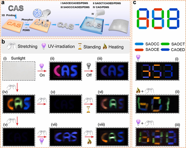 基于SAOCL/PDMS独特的力致发光性能,该文章进一步设计开发了可视化温度传感和图案化信息储存两种光学器件。