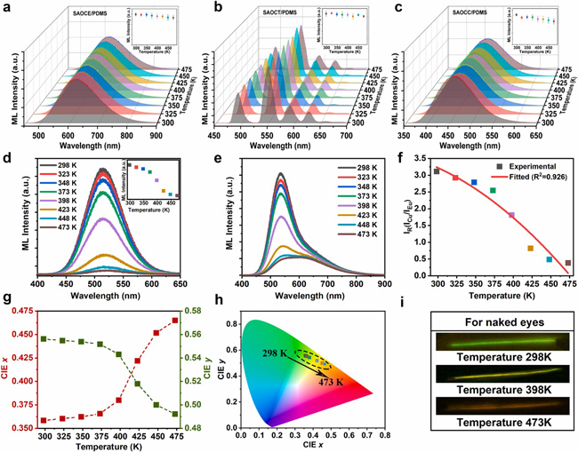 图4 (a-c)SAOCL/PDMS复合弹性体在不同温度下的力致发光光谱;(d)ZnS:Cu/PDMS复合弹性体在不同温度下的力致发光光谱; (e)SAOCE/ZnS:Cu/PDMS在不同温度下的ML光谱;(f)温度诱导SAOCE/ZnS:Cu/PDMS的ICu/IEu变化;(g) 颜色坐标(x, y)与环境温度之间的相关性; (h) 温度诱导的SAOCE/ ZnS:Cu/PDMS的ML色演变;(i) 用肉眼直接观察ML颜色进行可视化的温度感应。