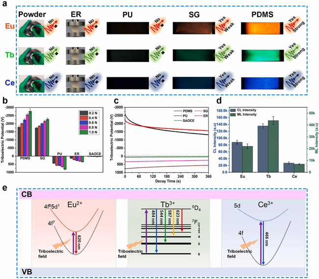 图3 (a)各种复合弹性体力致发光性能图示; (b) 不同载荷条件下聚合物基体与SAOCE粉末摩擦1min时的表面摩擦电势; (c) 聚合物表面摩擦电位衰减速率; (d) SAOCL/PDMS弹性体的ML强度和SAOCL粉末的CL强度对比;(e)SAOCL/PDMS复合弹性体的非压电ML机制示意图。
