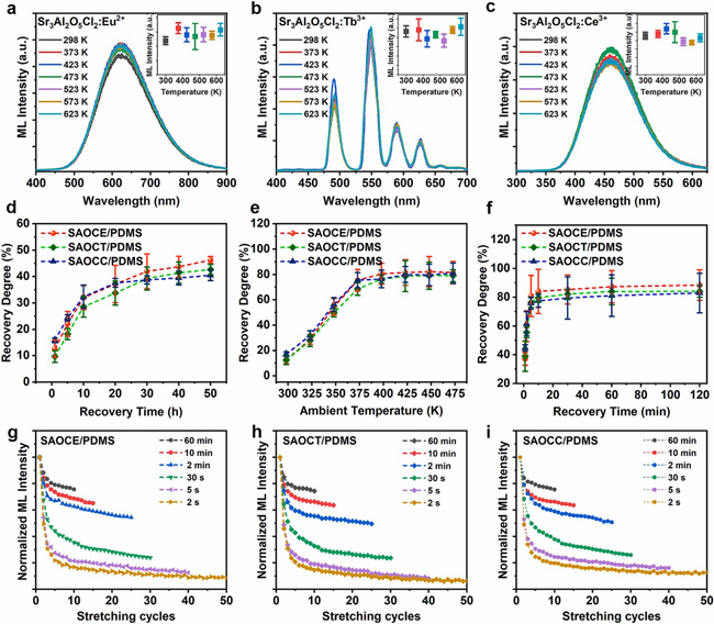 图2 (a-c)不同温度下预热处理的ML强度;(d)SAOCL/PDMS复合弹性体在室温下的自恢复特性(e)SAOCL/PDMS复合弹性体在不同环境温度下放置5 min和(f)在398 K下放置不同时间的自恢复程度;(g-i)SAOCL/PDMS复合弹性体在 398 K不同时间间隔拉伸ML发光的循环稳定性。