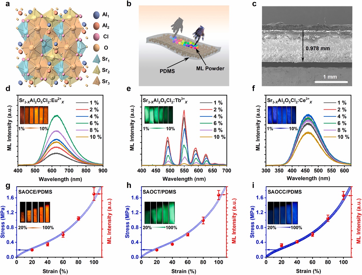 图1 (a)Sr3Al2O5Cl2晶体结构;(b)复合弹性体示意图;(c)横截面SEM图;(d-f)不同Eu2+、Tb3+和Ce3+掺杂浓度下,SAOCL/PDMS的ML图;(g-i)*佳掺杂浓度下,ML对应力、应变的响应曲线。