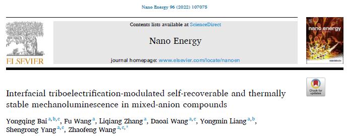中国科学院兰州化学物理研究所王赵锋研究员团队在国际知名期刊Nano energy上发表了题为“Interfacial triboelectrification-modulated self-recoverable and thermally stable mechanoluminescence in mixed-anion compounds” 的研究论文。该文章通过有机-无机复合策略制备了具有自恢复性能的非压电ML材料Sr3Al2O5Cl2:Ln (SAOCL;Ln = Eu2+, Tb3+, Ce3+)/PDMS,并首次提出摩擦电场诱导电子轰击模型解释这一力致发光现象。