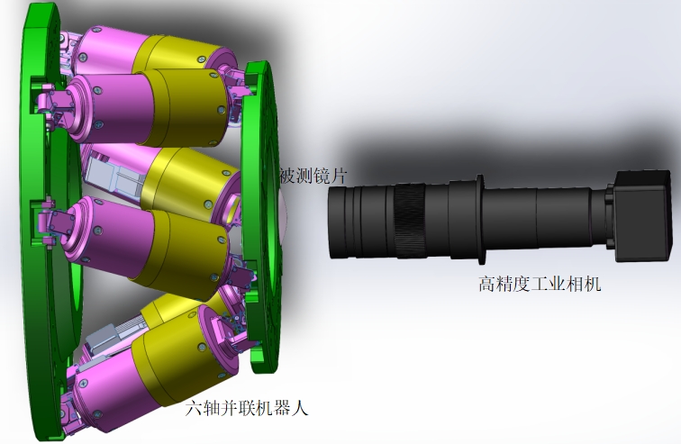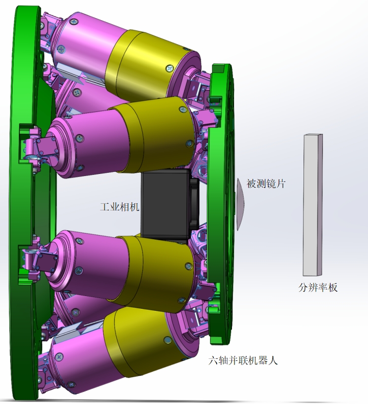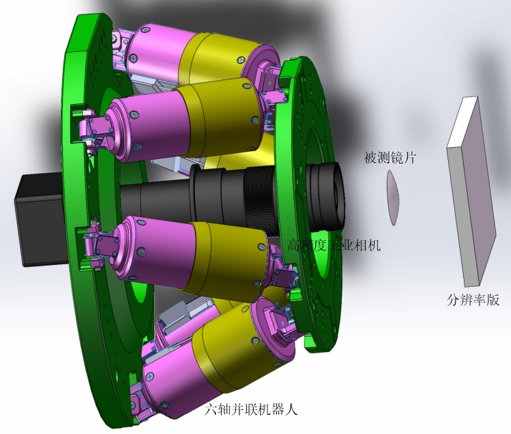 调整机构:调整工业相机、被测镜片、分辨率测试图案的相对机构。在本方案中使用六轴并联机器人来完成。