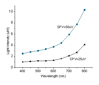 图3 表面光电压强度SPV=25uV/50uV下,测量并绘制光强值和波长的曲线图