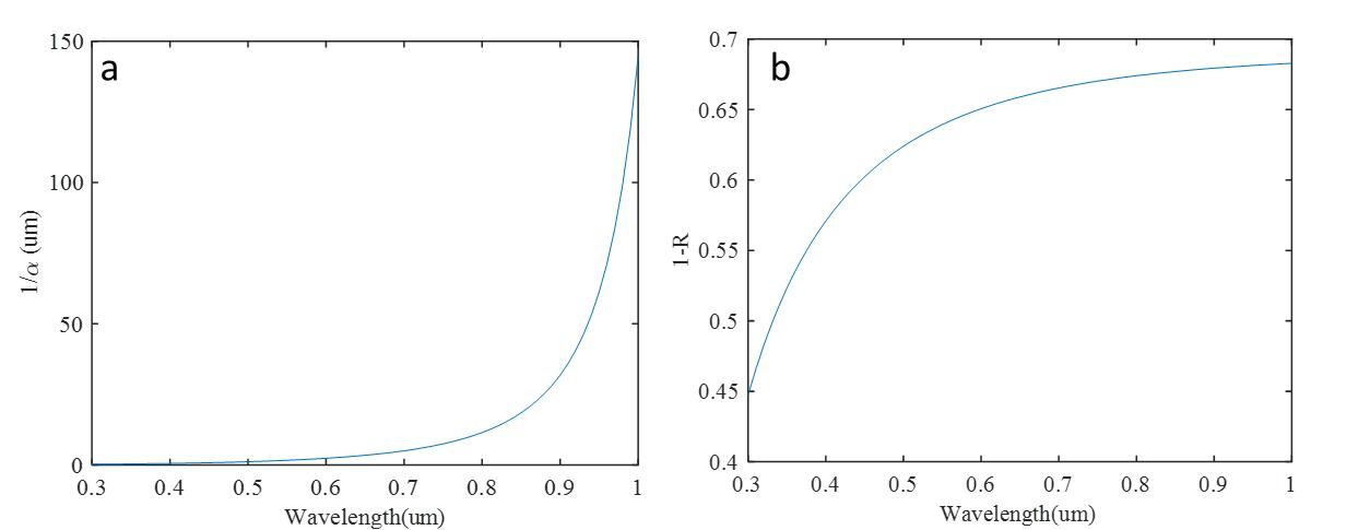 图4a根据公式1得到吸收系数的倒数和波长的关系; 图4b根据公式2得到(1-R(λ))和波长的关系。